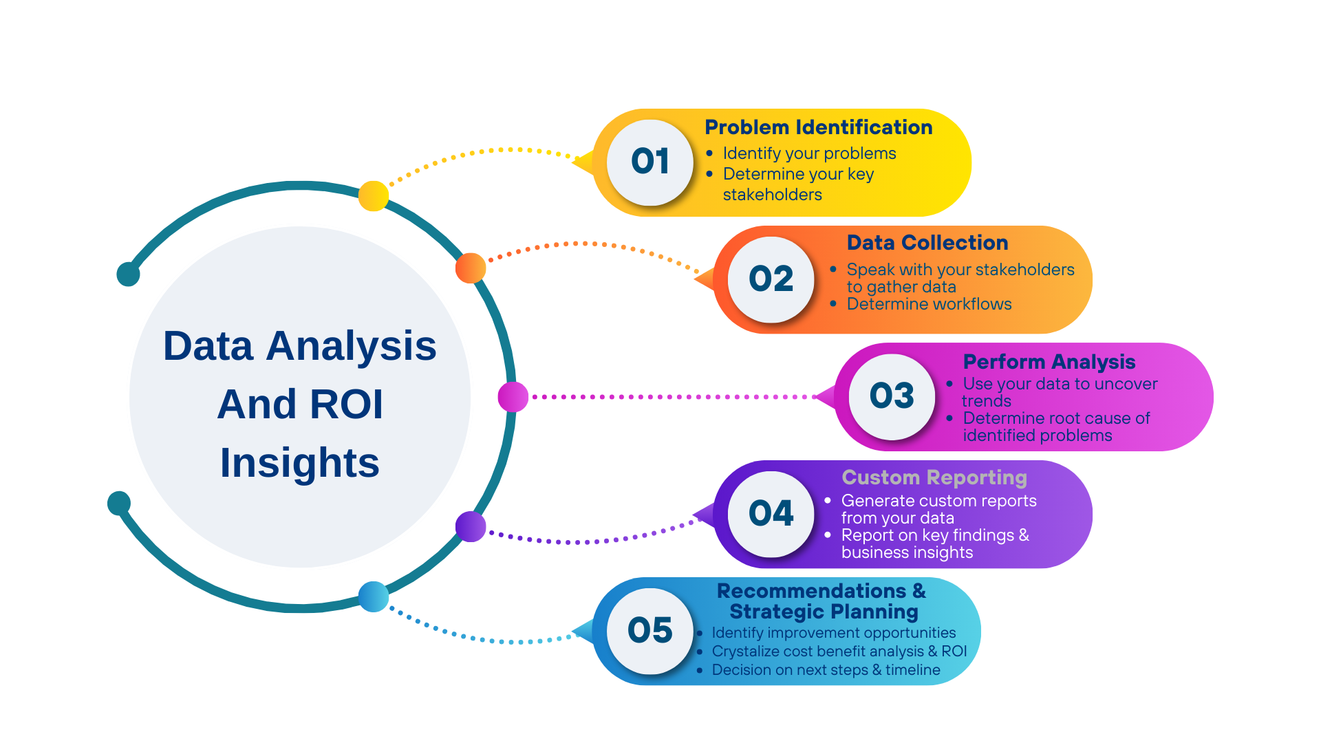 Unleashing the power of data is not just about crunching the numbers; it is about translating that data into actionable insights. Our Data Analysis & ROI Insights service is designed to guide healthcare leaders like you beyond mere dashboards, diving deep to uncover the story that your numbers are telling.